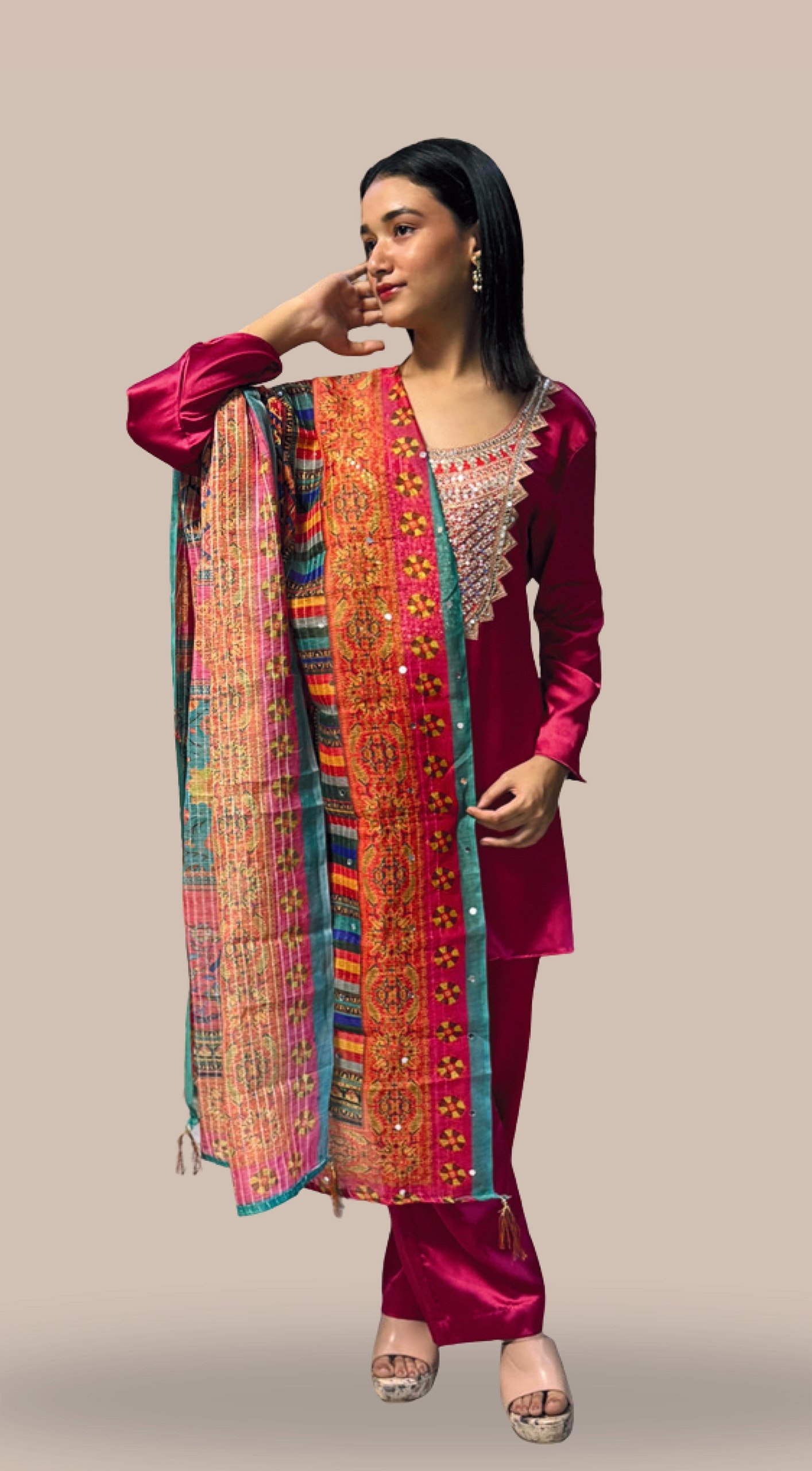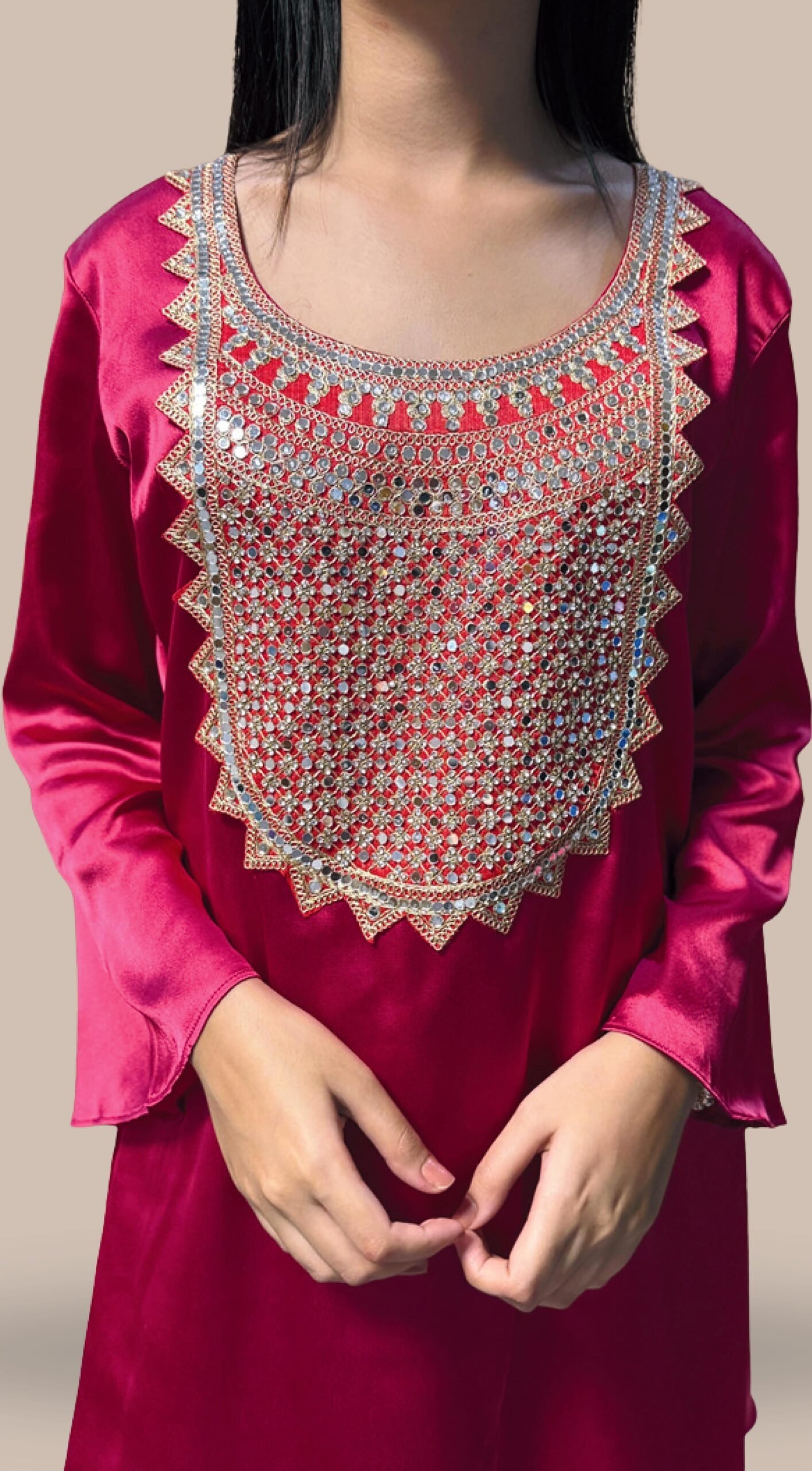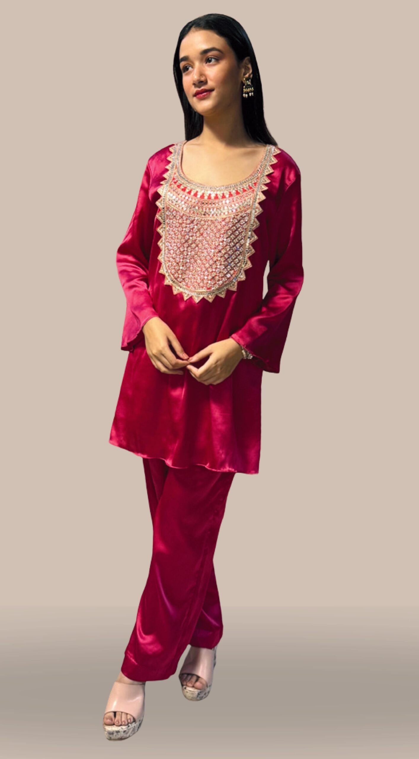 kurta = Satin, Pants = Satin, Dupatta = Crepe