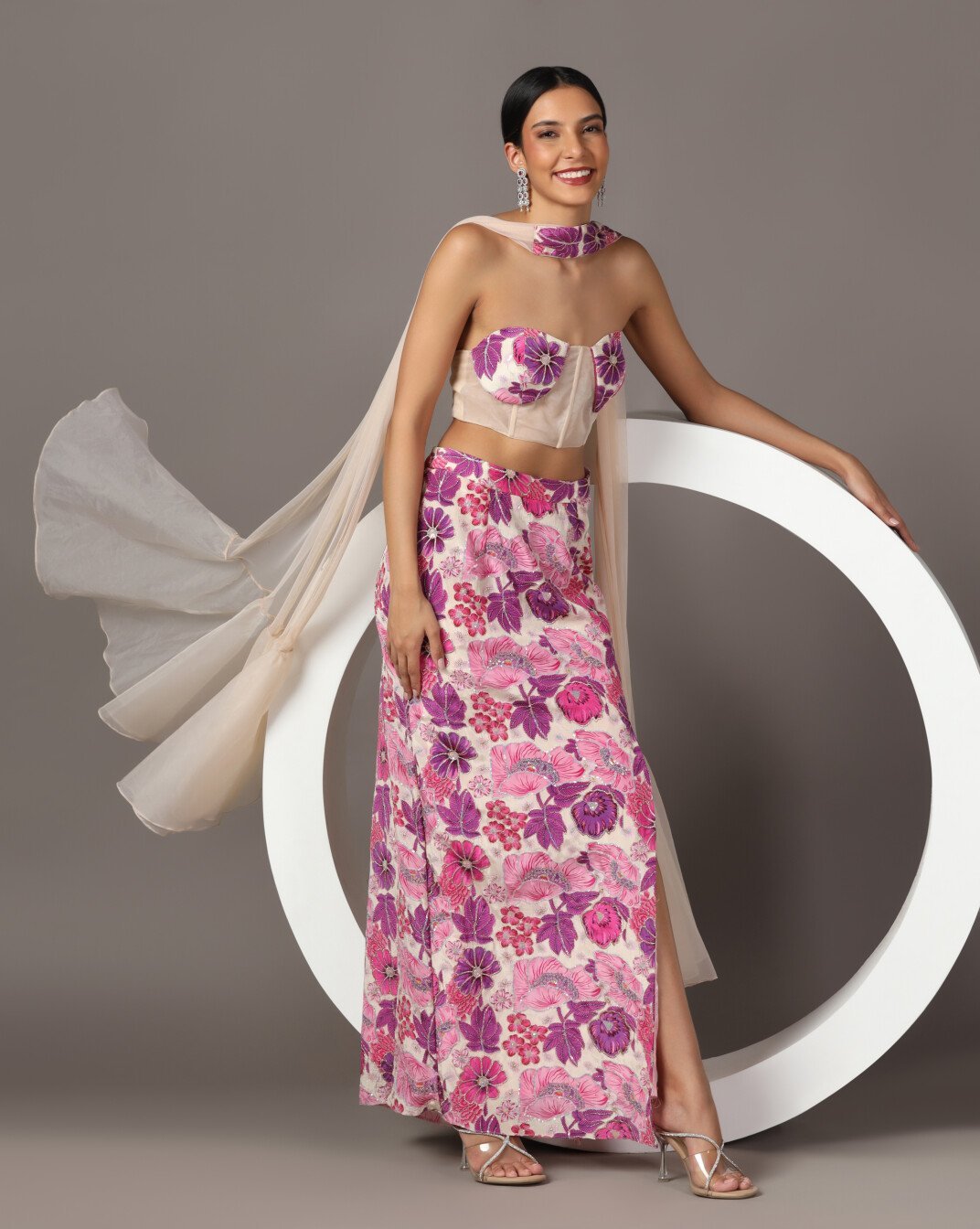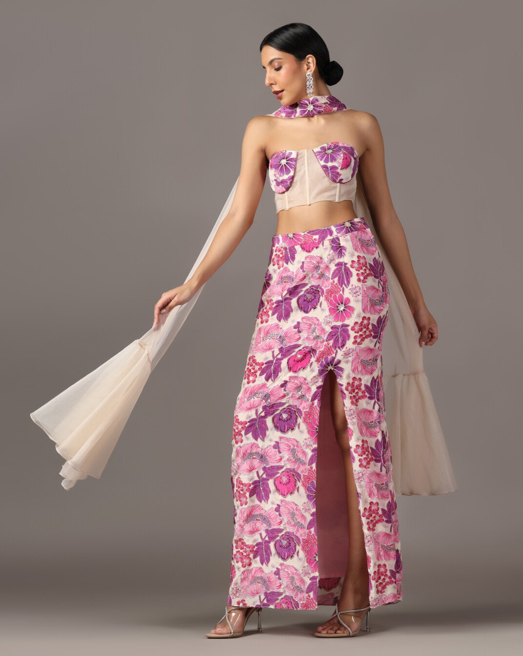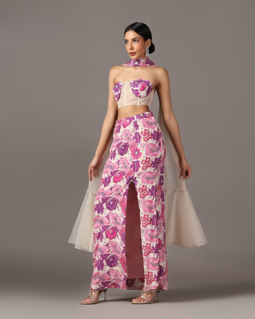Description:Slitcut skirt with corset and choker Dupatta